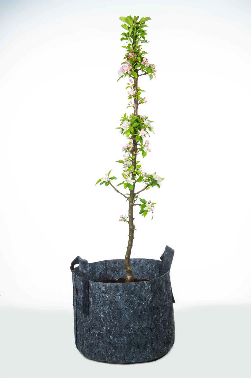 Die Pflanztasche ist eine umweltfreundliche Alternative zu den bekannten Kunststoff-Pflanzgefäßen. Synthetische Fasern aus recycelten PET-Flaschen werden zu einem atmungsaktiven Gewebe verarbeitet, das Luft und Wasser durchlässt.